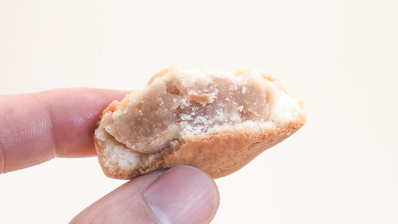カステラ生地の中にクルミ入りの白餡が入っています。