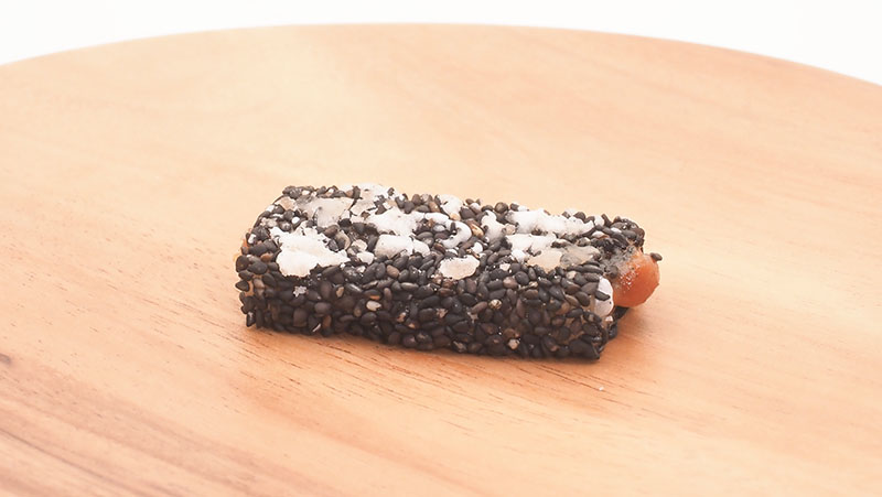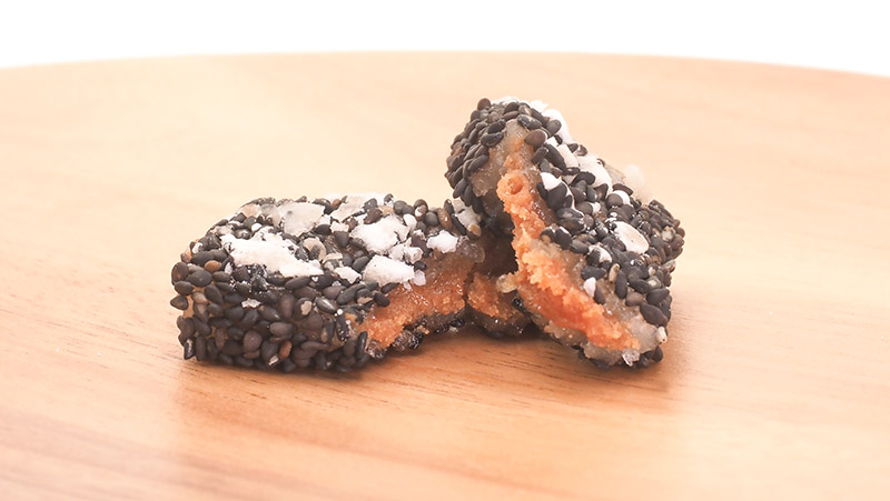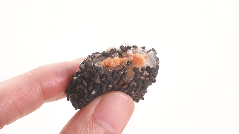 黒ゴマで覆われたお餅。見た目はゴツゴツしてますが触った感じはプニプニしてます。