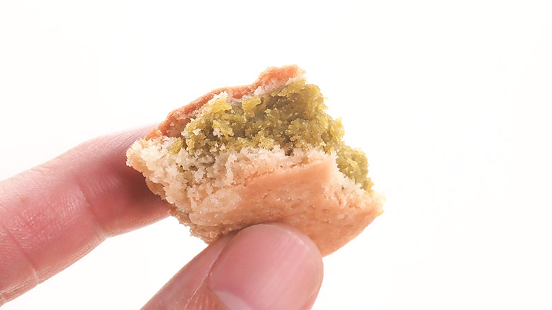 カステラ生地の中には深い緑色の餡。濃いめの抹茶餡のようにも見えますが、これが”ピスタチオ餡”です。
