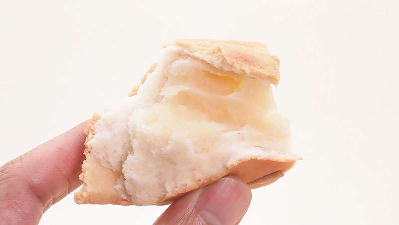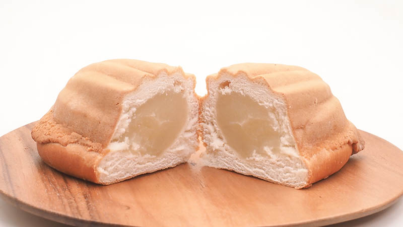 中にはメロン風味のカスタード餡がたっぷり。この餡の質量がすごくて、重さの正体でもあります。