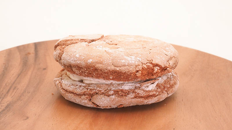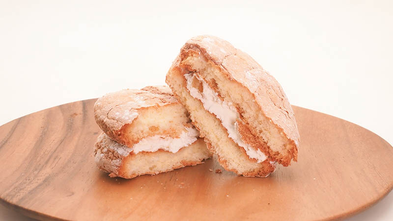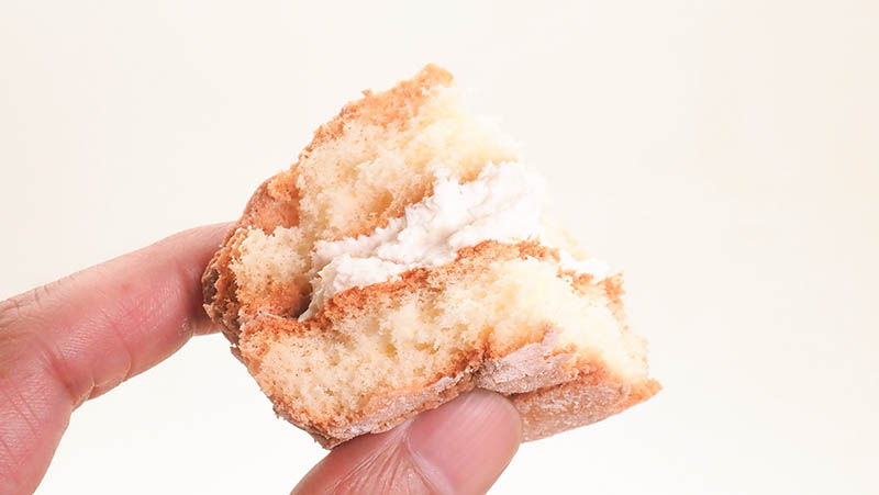 すごい厚みのあるブッセです。外側はカリッと焼き上げられていて粉砂糖が振りかけられています。
