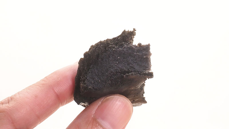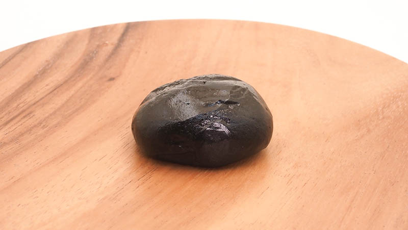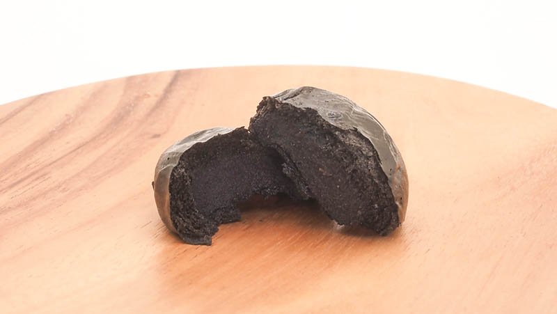 割ってみても中はすごい黒さ。黒ごま餡に竹炭を練り込んであるのでしょうが、光を吸収するようなマットな質感で竹炭のすごさを感じます。
