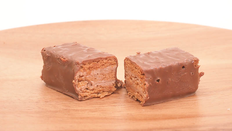 半分に切ってみるとザクっとした質感で綺麗にパイ生地が層になっています。これはジャンドゥーヤのクリームが入っているやつですね。ちょっとチョコレートが溶けてしまっているので、他のやつを冷蔵庫に入れました。