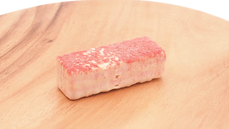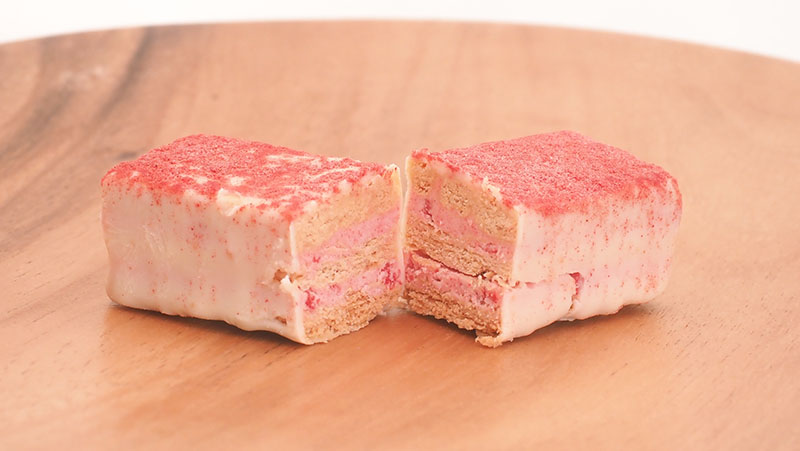 いちご味のはホワイトチョコレートでコーティングされており上部にパウダーがかかっています。見た目がファンシーな感じのミルフィーユです。