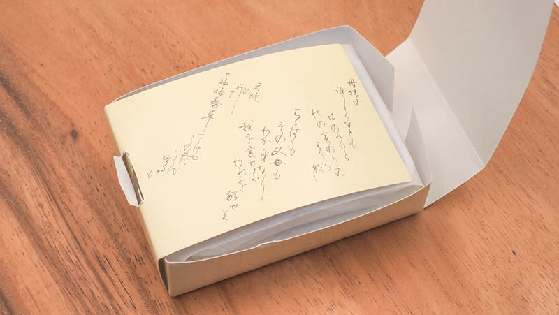 梅と胡麻の餡を羽二重餅で包んだ餅菓子で、箱に書かれている詩は、二宮尊徳翁の『天地の和して一輪福寿草 ~』から始まる詩ですね。